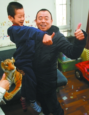 昨天上午,在本報(bào)記者和信報(bào)記者的陪同下,抱著一只玩具老虎的潘長(zhǎng)江來(lái)到了位于南四環(huán)的韜寶家中。潘長(zhǎng)江的到來(lái)讓韜寶的父母格外欣喜感動(dòng),但以往只在電視里見(jiàn)過(guò)潘長(zhǎng)江的小韜寶起初有些“認(rèn)生”。不過(guò),當(dāng)他一眼看見(jiàn)潘長(zhǎng)江手中的CD時(shí),立刻興奮得一躍而起,拿過(guò)CD就急著要播放。尤其當(dāng)他聽(tīng)到《過(guò)河》的旋律時(shí),更是興奮地滿(mǎn)地打滾,并模仿起潘長(zhǎng)江在《過(guò)河》中的表演。