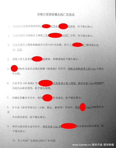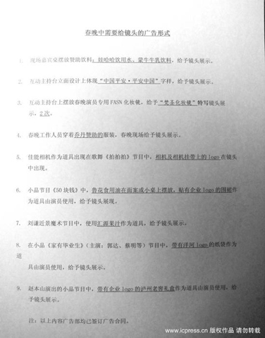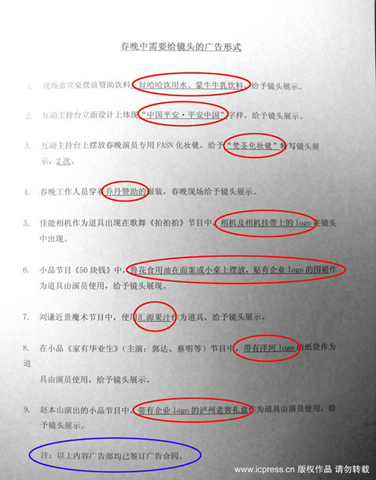 新民網(wǎng)3月2日報道 2010年3月1日,北京,央視虎年春晚廣告植入清單曝光,列出內(nèi)容次數(shù)、注明已簽合同,春晚當(dāng)天需要給鏡頭的廣告形式都一一羅列,包括飲用水、化妝鏡、服飾、相機、酒等名目繁多。