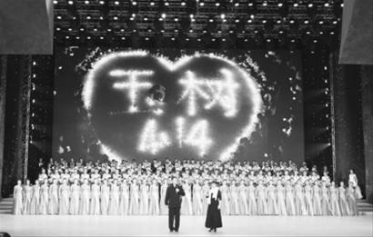 昨晚的《情系玉樹,大愛(ài)無(wú)疆——抗震救災(zāi)募捐活動(dòng)特別節(jié)目》賑災(zāi)晚會(huì),以新聞事件為主線,串起文藝演出和募捐活動(dòng)。晚會(huì)按照時(shí)間的順序,穿插回放地震發(fā)生后的救援大事記,救援中的感人故事以及來(lái)自震區(qū)的報(bào)道,均出現(xiàn)在募捐現(xiàn)場(chǎng)。晚會(huì)一開(kāi)始,在主持人白巖松的呼吁下,現(xiàn)場(chǎng)全體人士集體默哀三分鐘,隨后由百余位文體、曲藝界明星演唱了《我們眾志成城》,王菲、那英等明星領(lǐng)唱。