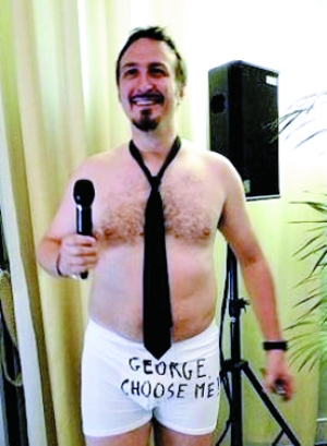 出人意料的是,一名意大利男記者也向喬治索吻:“喬治,選我,選我。我能吻你嗎?就一次!”說(shuō)話間,他脫去上衣和褲子,只剩黑領(lǐng)帶和短褲,短褲前面還寫(xiě)著“GEORGE,CHOOSE ME(喬治,選我)”?唆斈崽幾儾惑@,微微一笑:“你敢冒這么大的風(fēng)險(xiǎn)非常勇敢,可惜它并不奏效。不過(guò),你的領(lǐng)帶非常漂亮,而且很長(zhǎng)。”克魯尼的幽默引來(lái)全場(chǎng)大笑。
