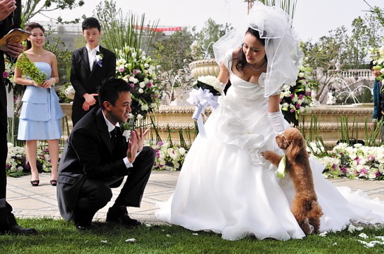 王學(xué)兵和孫寧別有新意地用他們的愛(ài)犬充當(dāng)傳遞愛(ài)的使者,由愛(ài)犬將結(jié)婚戒指帶到現(xiàn)場(chǎng)。交換結(jié)婚戒指后,王學(xué)兵與孫寧舉起香檳向親友祝酒。