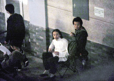 隨后,廖凡、邵兵、張默一一亮相,他們都準(zhǔn)備化妝拍戲,廖凡和張默留著鍋蓋頭,一看似乎就是下級(jí)土匪,而邵兵留著平頭和兩撇細(xì)細(xì)的小胡子,看上去可能是一個(gè)“中隊(duì)長(zhǎng)”式的角色。雖然廖凡也留著小胡子,但他的胡子卻顯出一股“兇氣”。