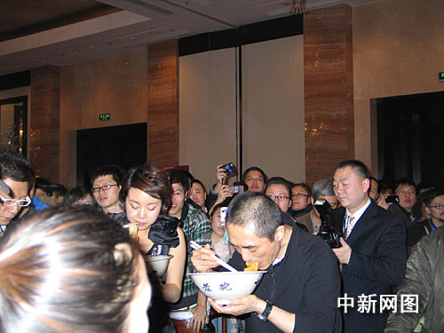 在《三槍》中,“高桌子低板凳都是木頭”的陜西話地道風(fēng)趣,熱氣騰騰的油潑面更讓中國(guó)各地觀眾頓生興趣。很多觀眾看完 《三槍》,第一感覺(jué)就是想來(lái)一碗熱辣辣的油潑面。影片結(jié)尾,所有人復(fù)活,一起狂吃油潑面,場(chǎng)面壯觀。而今天,張藝謀、孫紅雷、閆妮、小沈陽(yáng)、倪大紅等主創(chuàng)也當(dāng)眾“秀”了一把陜西油潑面。如《三槍》中的歌詞所唱:“吃碗油潑面,我保準(zhǔn)就能啪啪地沖鋒向前”。