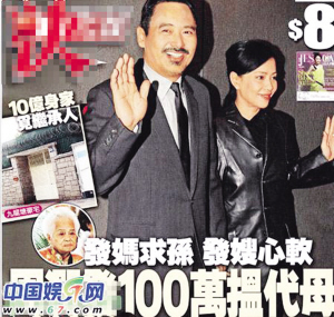 昨日有香港媒體報(bào)道,年屆九旬的發(fā)媽陳麗芳希望發(fā)哥能夠找代孕,為周家添后,一圓20多年的夙愿,同時(shí)也為周潤(rùn)發(fā)10億元的家產(chǎn)“制造”繼承人。據(jù)知,有人提出以一百萬元代價(jià),在內(nèi)地尋覓優(yōu)質(zhì)代母,務(wù)求一擊即中。