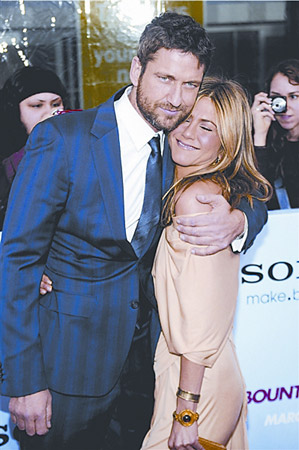 電影《賞金獵手》16日在紐約舉行首映式。主角詹妮弗·安妮斯頓與杰拉德·巴特勒相擁登場。兩人在拍片過程中多次傳出緋聞,首映現(xiàn)場兩人大方地拿緋聞開玩笑,還做出各種夸張的親熱動作,好似一對真戀人。