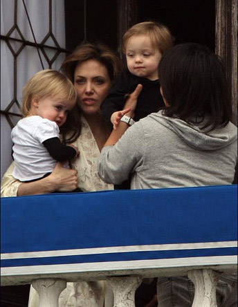 安吉麗娜·朱莉當(dāng)?shù)貢r(shí)間3月26日在位于威尼斯住所的陽臺(tái)上抱著龍鳳胎女兒Vivienne、兒子Knox觀賞美景。就在前一天,朱莉曾抱著女兒Vivienne在陽臺(tái)上親吻玩樂,而把兒子放在房?jī)?nèi)隔窗而望。此次,身穿白色睡袍的朱莉睡眼朦朧,像是剛睡醒的樣子,她一人抱兩個(gè),生怕被說偏心,然而她卻明顯很吃力,抱了一會(huì)便不得不讓保姆出來幫忙。