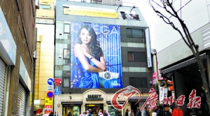 章子怡為著名手表廠商歐米茄做代言的大幅廣告海報(bào)當(dāng)?shù)貢r(shí)間4月3日出現(xiàn)在日本東京最繁華的市中心新宿街頭。(余樂)