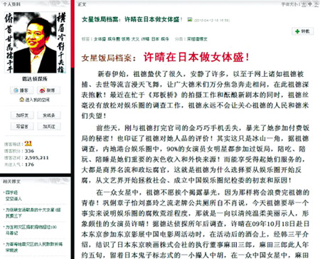 近日,宋祖德在博客中稱許晴去年在日本參加?xùn)|京電影節(jié)期間,曾以“女體盛”(日語(yǔ)意為用少女裸露身軀作盛器裝盛大壽司的宴席)的方式換回日商對(duì)中影集團(tuán)將要投拍的影片《國(guó)父孫中山》的投資。4月26日,中國(guó)電影表演藝術(shù)學(xué)會(huì)針對(duì)此博客發(fā)出聲明,表示中影集團(tuán)沒(méi)有拍攝《國(guó)父孫中山》的計(jì)劃,中影集團(tuán)董事長(zhǎng)韓三平和許晴均沒(méi)有博客中涉及的相關(guān)行程,“所謂韓三平和許晴在東京見(jiàn)面謀劃和日商合作一事純屬無(wú)稽之談”。
