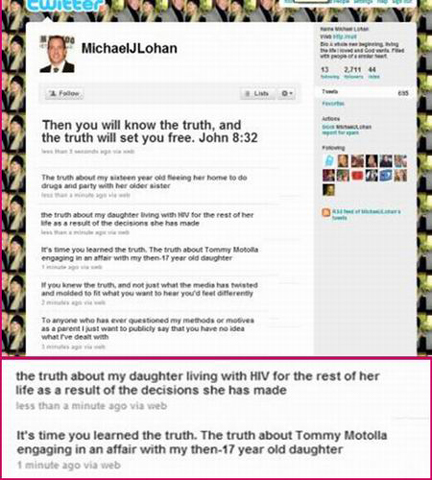 臺灣“今日新聞”報道稱,邁克爾在其微博上說,林賽現(xiàn)在的行徑會如此荒唐,完全是因為得了艾滋病,因此她決定就這樣渾渾噩噩過一生!但很快邁克爾卻突然將消息撤下,聲稱自己的微博網頁被黑客入侵,網頁上所言都不是事實。