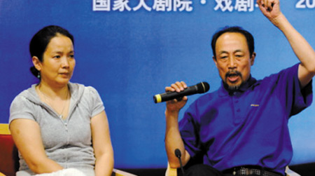 最激動(dòng)的是飾演主角“培爾”的孫海英,打扮隨意的他剛拿起話筒時(shí)語調(diào)十分平靜,還被一旁的老伴呂麗萍調(diào)侃“說話像領(lǐng)導(dǎo)”。但談到演《培爾·金特》的感受,他的語調(diào)頓時(shí)激動(dòng)起來,更大嘆“話劇已死”:“現(xiàn)在的戲劇都是在作假,互相說假話。人們都太浮躁,明明看不懂我們這部戲,只是看個(gè)熱鬧,到半場(chǎng)就回家了,還愣說看得懂———你明白個(gè)屁呀!什么都不明白!藝術(shù)不是因?yàn)槟愣艁淼,是因(yàn)椴欢艁淼模床欢憔偷脤W(xué)!我們不需要迎合大眾,你愛來不來!