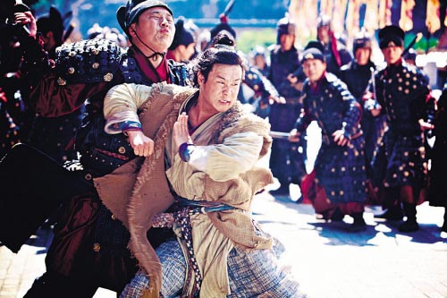如果說被鋼絲吊在半空“飛”難不倒小沈陽,那么接下來的打戲則是難度不小,因為小沈陽聲稱不必用替身,而程小東又是有名的較真導(dǎo)演,對動作細節(jié)的要求之苛刻達到“令人發(fā)指”的程度,因此小沈陽接受了更大的挑戰(zhàn)。這段時間橫店悶熱難耐,有一場小沈陽殺進皇宮英雄救美的戲,對手演員是片中大反派——第一高手徐少強。這種天氣穿著厚厚的古裝拍戲,即便站著不動都會汗流浹背,何況還是拍動作戲,當小沈陽在程導(dǎo)的指揮下一遍遍拳打腳踢、跳躍騰挪后,早已是揮汗如雨,幾乎每拍一個鏡頭都要換下一身汗?jié)竦膽蚍?/p>