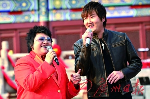 太廟前,韓紅特意一身戎裝亮相,英姿颯爽。她首先抱著吉他走上太廟階梯,以高亢細(xì)膩的嗓音演唱了具有國(guó)際性音樂(lè)元素的《聽(tīng)我的聲音》等歌曲,而最后一首西藏風(fēng)格的《歸來(lái)》則請(qǐng)三寶親自指揮。
