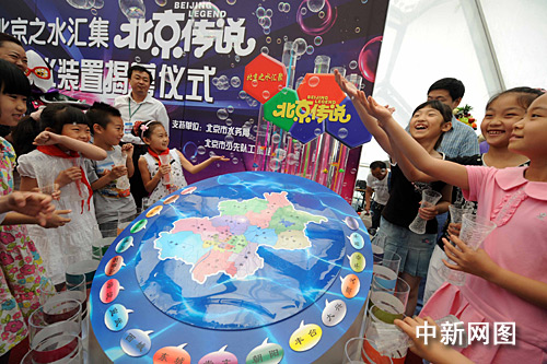 “北京之水匯集北京傳說”活動(dòng)是圍繞北京兒藝六一大戲《北京傳說》中的節(jié)水環(huán)保主題而開展的、面向北京所有小學(xué)生及學(xué)齡前兒童的大型環(huán)保節(jié)水公益行動(dòng),F(xiàn)場(chǎng)12位節(jié)水小明星代表一起把他們從北京各水系取來的水標(biāo)本匯集到“北京之水”大型環(huán)保容水裝置中,這一裝置高1.5米,它以藍(lán)色水波紋狀物體為底座,上方圓弧狀轉(zhuǎn)盤中用顯著顏色標(biāo)識(shí)出北京水系分布情況,5月28日至6月1日《北京傳說》演出期間,該容器將放置在水立方場(chǎng)內(nèi),成為一道環(huán)保新景觀。
