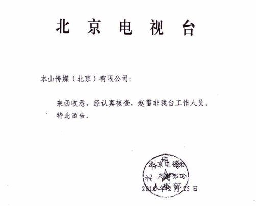 近日,在網(wǎng)上出現(xiàn)了一條消息,作者自稱是北京電視臺導(dǎo)演趙雷。消息稱趙本山在央視春晚演完《捐助》后,因?yàn)樾∩蜿栍袃蓚廣告包袱沒抖出來,在后臺打了小沈陽兩記耳光。對此,本山傳媒鄭重聲明,這條消息純屬捏造。另外,本山傳媒已致函北京電視臺人事部,了解趙雷的身份。北京電視臺人事部回函聲明,趙雷不是北京電視臺工作人員。