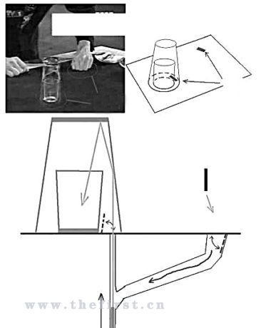 網(wǎng)友分析:在這個魔術(shù)中,我們可以注意到,大杯與小杯中間仍有縫隙,大杯是倒著放的,小杯則是正立著套在大杯里的。黑色的桌布主要是為了掩飾從桌下彈射硬幣的出口。在表演時,劉謙攥著硬幣的手曾一直放在桌子的左下角,其實那里正是硬幣進(jìn)入的地方。經(jīng)過桌下的機關(guān),硬幣順勢滑到杯子下方。觀眾們看到的是硬幣從小杯子與大杯子間的桌面射進(jìn)大杯然后被大杯壁和大杯底2次反彈后落入小杯中的。經(jīng)推斷,劉謙應(yīng)該還在桌子某個位置布置了一個彈射硬幣的機關(guān),從而讓硬幣從桌布下面射出來。