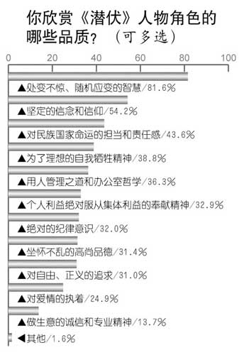 觀眾欣賞《潛伏》中人物的哪些品質(zhì)?調(diào)查中81.6%的人首推“處變不驚、隨機應變的智慧”,54.2%的人選擇“堅定的信念和信仰”,43.6%的人選擇了“對民族國家命運的擔當和責任感”,接下來依次為:“為了理想的自我犧牲精神”(38.8%),“用人管理之道和辦公室哲學”(36.3%),“個人利益絕對服從集體利益的奉獻精神”(32.9%),“絕對的紀律意識”(32.0%),“坐懷不亂的高尚品德”(31.4%),“對自由、正義的追求”(31.0%),“對愛情的執(zhí)著”(24.9%),“做生意的誠信和專業(yè)精神”(13.7%)。