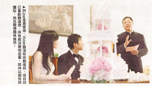 5日下午,一眾出席倪周婚禮的賓客在四時(shí)前到場(chǎng),獲邀擔(dān)任證婚人的是好友Kenny與丈夫吳先生;橐霰O(jiān)理人由陳姓律師擔(dān)任,儀式簡(jiǎn)單卻神圣。一對(duì)新人宣讀誓詞,然后交換結(jié)婚戒指,簽上名字,再將別致的羽毛筆交到婚姻監(jiān)理人與證婚人手上,簽名后林以諾牧師現(xiàn)身,宣讀哥林多前書(shū)十三章至八節(jié)——愛(ài)是恒久忍耐,又有恩慈,愛(ài)是不嫉妒,愛(ài)是不自夸,不張狂……以祝福一對(duì)有情人,壓軸節(jié)目是新人切結(jié)婚蛋糕,與眾同樂(lè),一起分享甜蜜滋味。