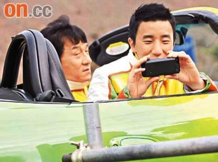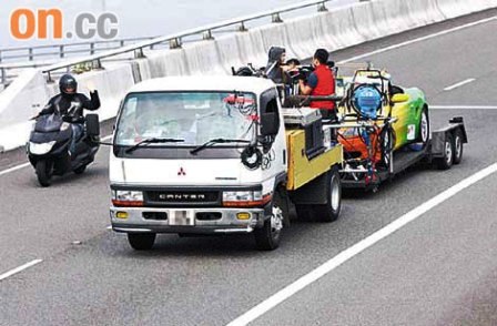昨日清晨七時(shí),成龍與祖名穿超時(shí)空戰(zhàn)士的“父子裝”抵達(dá)青馬大橋,駕駛熒光黃色和綠色的左跑車,車尾則放了一大箱冰凍道具樽裝茶,非常搶眼。坐在司機(jī)位的成龍?jiān)诠飞巷L(fēng)馳電掣,狀甚威風(fēng),其實(shí)他們的跑車被固定在貨車托尾板上,相反攝影師要站在托尾板上拍攝,當(dāng)有大風(fēng)或大貨車經(jīng)過(guò)扯風(fēng)時(shí),令攝影師搖搖欲墜,驚險(xiǎn)萬(wàn)分。