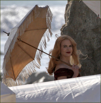 妮可·基德曼2月19日在洛杉磯的某海灘上為某雜志拍攝宣傳寫真,當(dāng)天的妮可·基德曼化身中世紀(jì)的貴婦,穿著暗紅色的絕美長裙,襯得身材玲瓏,肌膚透白,手中的陽傘更是增添了高貴優(yōu)雅,和妮可·基德曼得天獨厚的氣質(zhì)完全符合。