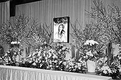飯島愛的遺體告別式現(xiàn)場(chǎng)布置得非常肅穆,中央場(chǎng)地懸掛了飯島愛遺照,是由日本知名攝影師筱山紀(jì)信拍攝的,曾刊登在《婦人公論》上。同時(shí)祭壇上還擺滿了飯島愛生前最喜歡的卡薩布蘭卡,這種花的花語(yǔ)是永不磨滅的愛情,象征了家人友人,以及粉絲們對(duì)飯島愛永不磨滅的愛。周圍用樹枝和純白鮮花做裝飾,場(chǎng)地整體顯得肅穆莊重。