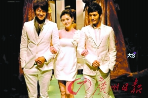 當(dāng)天,三位男女主角的現(xiàn)身方式十分特別。兩大帥哥黃曉明、何潤(rùn)東伴在大S兩側(cè), 坐在輕紗籠罩的華麗纜車(chē)上,徐徐空降到透明T臺(tái)上。三位偶像各自賣(mài)力秀出迷人微笑,揮手向粉絲致意。超短裙搭超高銀色高跟鞋,大S挽著兩位帥哥走過(guò)透明T臺(tái),享受著在座女性妒忌的眼光。
