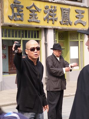 根據(jù)劇組的通告,昨日《建國大業(yè)》劇組從早晨6點30分就開工拍攝。當早報記者于中午時分趕到車墩時,導演黃建新正在“拍兩個不知名人士的戲份”,不見“蔣介石”的扮演者張國立,但劇組人員保證“張國立今天來了片場”。下午2點,劇組午休時間結(jié)束!澳暇┞贰鄙虾鋈欢喑隽艘蝗汉谝潞诿、幫派打扮的群眾演員。同時,一輛車輪外側(cè)被涂成金色的“另類”黃包車也出現(xiàn)在“南京路”的一頭。幾分鐘后,現(xiàn)場忽然一陣騷動,許多原本在附近休息的游客都涌向了“南京路”口,拿出相機拍個不停。原來是“杜月笙”馮小剛出現(xiàn)了。同時,還有一個光頭、戴著墨鏡、手執(zhí)大喇叭的男子,在給馮小剛以及現(xiàn)場的群眾演員安排走位。仔細一看,這位“現(xiàn)場導演”不是別人,正是“蔣介石”張國立。原來整個上午,張國立并沒有休息,而是呆在劇組在片場臨時設(shè)置的工作室內(nèi),和另一位導演韓三平一起,看之前拍攝的回放。