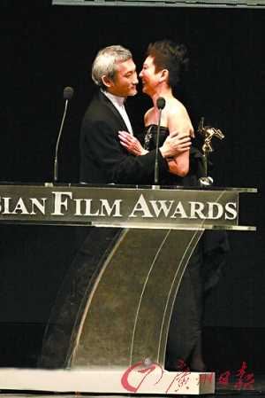 在發(fā)表感言時(shí),說(shuō)到動(dòng)容時(shí),徐克還擁抱并親吻了施南生。在后臺(tái)采訪時(shí),施南生回吻了徐克一下。問他們是不是真情流露,施南生卻不愿承認(rèn),開玩笑說(shuō):“還不是為了攝影記者好拍,為人民服務(wù)!辈贿^臉色出賣了她,她依然一臉緋紅。