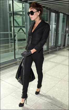 維多利亞·貝克漢姆前幾日還是一襲白衣出現在公眾的面前,昨天(2月11日)就換上了一身黑衣服出現了,這次還真是黑的徹底,黑頭發(fā),黑墨鏡,黑衣服,黑褲子,黑手套,黑書包加黑面,一黑到底。手腕上的金手鐲提升亮點,但是真是黑啊。