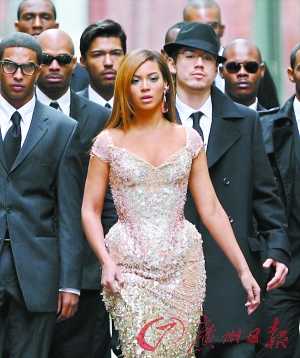 一襲Tierry Mugler釘珠鑲亮片緊身長禮服,讓碧昂絲著名的豐胸、蜂腰、豐臀身材一覽無遺,她身后更有一群身穿黑色西裝的猛男尾隨,更凸顯她的“女王”豐姿。