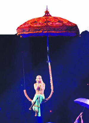 3月初,“小甜甜”布蘭妮展開她的復出巡回演唱會, 多變的造型堪比麥當娜,內(nèi)衣外穿,野蠻女警等造型都堪稱火辣。為配合新專輯《馬戲團》,布蘭妮打扮成馬戲團表演者,在舞臺上奉獻了很多雜技表演,她還蒙上眼睛與兩名男舞者一起跳舞一起演唱《Touch of My Hand》。她在高空坐在“傘柄”上以印度舞娘造型出場,遠看甚為驚艷,近看發(fā)現(xiàn)她腹部堆積著贅肉,跳肚皮舞倒是不錯。看來布蘭妮還需要減肥。
