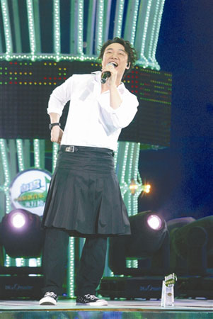 2009“雪碧中國原創(chuàng)音樂流行榜”日前在京揭曉,勇奪5項大獎的陳奕迅穿著裙子亮相,他稱自己近年都是自己做造型師,裙子是逛街時偶然買回來的,想體會一下當女生感覺。