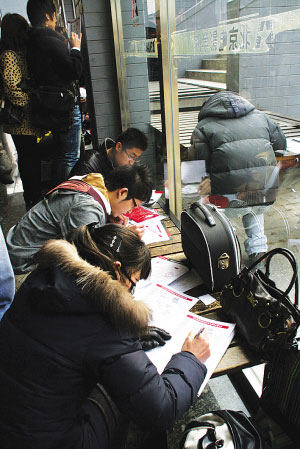 由于外地考生多,不少來(lái)報(bào)名的考生都是拖著行李直奔考場(chǎng),所以一些賓館也來(lái)到學(xué)院門口吆喝。附近煎餅攤兒的老板也樂(lè)開(kāi)了花,平時(shí)一天二三百元的買賣一下子翻番。記者 王瑜明