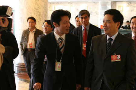點(diǎn)評(píng):棕色西服的設(shè)計(jì)和顏色不是很好,領(lǐng)子設(shè)計(jì)得不好,使得衣服線條下垂,十分顯老。而且,里邊的襯衣領(lǐng)子翻出來,顯得很累贅。不過,這種素氣的著裝比較符合兩會(huì)嚴(yán)肅的氛圍。