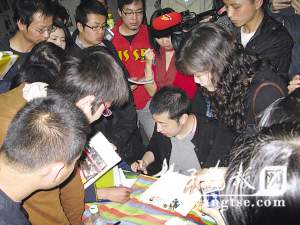 記者發(fā)現(xiàn)一位男青年手里抱著一堆書,忙前忙后地見人就問,你是賈導的影迷嗎?他告訴記者,他叫徐鑫,是賈樟柯影迷聯(lián)盟的成員,在北京讀大學時就喜愛看賈導的電影,聯(lián)盟的成員委托他來南京幫著要簽名,“有陜西、山西,還有江蘇無錫、常州的,這些書是幫他們簽的。” 徐鑫說,他此次來還有一個任務,就是發(fā)展成員。“聯(lián)盟剛剛成立不久,只有七八十人,今天收獲不小,至少有40多人表示愿意加入!庇浾邌査麑ΜF(xiàn)場火爆的情形怎么看,他認為,不排除有些大學生根本就沒看過賈導的電影和書,是來趕熱鬧的,把他當成了偶像。