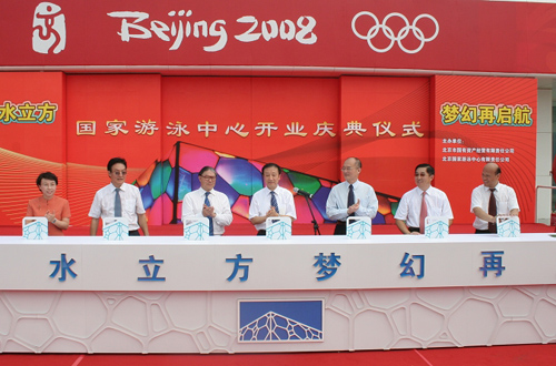 北京市副市長程紅在慶典中致辭。北京市委常委、統(tǒng)戰(zhàn)部部長牛有成宣布“國家游泳中心完成賽后改造,現(xiàn)重新對外開放”。隨后,中央及北京市有關(guān)領(lǐng)導(dǎo)、捐資人代表共同為水立方開啟“全新水立方 夢幻再啟航”的大門,水立方以嶄新的形象展現(xiàn)在社會公眾面前。參加慶典的領(lǐng)導(dǎo)隨后參觀了水立方場館,并出席了在水立方內(nèi)舉辦的“港澳臺同胞海外華僑華人支持北京2008奧運會紀念展揭幕儀式”。