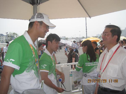 上午10時(shí)許,崔明華在世博園區(qū)志愿者部負(fù)責(zé)人的陪同下,看望了在中國館區(qū)域提供服務(wù)的華僑華人世博志愿者,并與他們親切交談。他仔細(xì)詢問了志愿者的工作狀況、身體情況以及為游客服務(wù)的事項(xiàng),叮囑他們在高溫下要照顧好自己的身體,更好地服務(wù)于游客。
