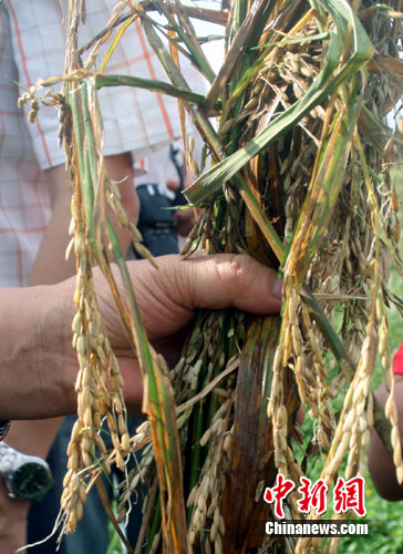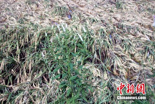 記者在當?shù)厮姡笃墒焱淼疽廊慌菰谒。拔起一株看見谷穗已?jīng)發(fā)芽。隨行的中國熱帶科學(xué)院專家分析說,這樣的稻谷人已無法食用,唯有趕緊翻地準備下一季生產(chǎn)。