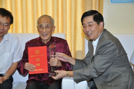 喬衛(wèi)向兩位院士介紹了中國僑聯(lián)組織及與國務(wù)院僑辦聯(lián)合開展“全國僑界十杰”評獎的情況,仔細詢問他們的工作生活和健康狀況。喬衛(wèi)代表中國僑聯(lián)向吳文俊院士和顏鳴皋院士頒發(fā)了“全國僑界十杰”獎杯和證書,并祝愿兩位院士健康長壽,生活愉快。