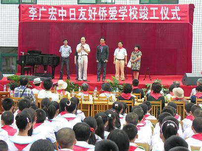 張繼勇在致辭中說,李廣宏先生情系四川、心系災(zāi)區(qū)。去年“5.12” 汶川特大地震發(fā)生后,李廣宏率日本友人五次來川,多次為災(zāi)區(qū)學(xué)生舉行演唱會(huì),用歌聲撫慰災(zāi)區(qū)學(xué)生受傷的心靈。后又拿出積蓄52.5萬元人民幣,在災(zāi)區(qū)捐建“李廣宏中日友好僑愛學(xué)校綜合樓”。今天,在各方面共同努力下,綜合教學(xué)樓終于建成了,我代表省僑辦對(duì)此表示熱烈祝賀,對(duì)李廣宏先生及日本友人的到來表示熱烈歡迎和衷心感謝。他希望學(xué)校師生搞好教學(xué),發(fā)奮勤學(xué),為實(shí)現(xiàn)四川省“兩個(gè)加快”努力工作,以優(yōu)異成績(jī)迎接建國(guó)60周年到來。