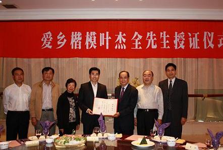 為表彰葉杰全先生重教興學(xué)、無(wú)償捐贈(zèng)的義舉,2007年10月,浙江省人民政府授予葉杰全“愛(ài)鄉(xiāng)楷!睒s譽(yù)稱號(hào)。(浙江僑辦 左新元)