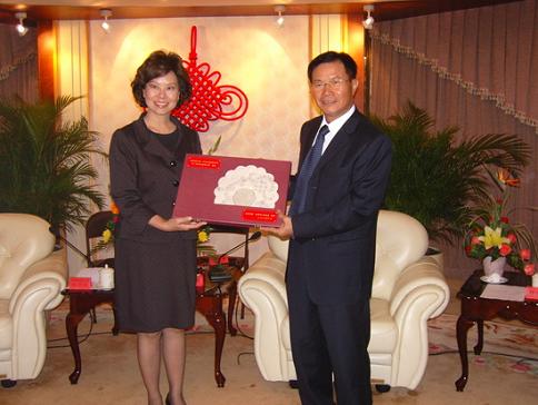 金秋十月的鮀城,山青水秀,風光迷人,給首次蒞汕的趙小蘭女士一行留下美好的印象。10月23日晚,趙小蘭接受汕頭市委副書記鄧大榮、副市長周鎮(zhèn)松等市領(lǐng)導(dǎo)的會見時,稱汕頭是一座美麗的海濱城市,從短短一天的參觀中,可以看出汕頭的工業(yè)非常發(fā)達,環(huán)境保護工作做得非常好,希望汕頭發(fā)展得越來越好。
