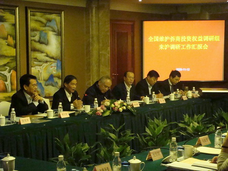 12日下午,上海維護僑商投資權益聯合調研工作匯報會和僑商座談會在上海衡山賓館召開。上海市僑辦主任崔明華向調研組匯報了上海維護僑商權益工作的基本情況、基本做法、主要體會和工作建議。上!拔鍍S”及相關委辦局的負責人參加匯報會并介紹上海各部門維護僑商權益工作情況。