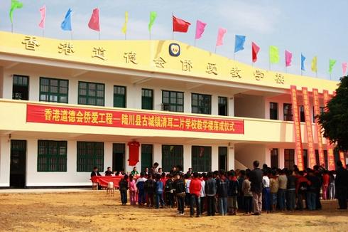 中新網(wǎng)11月19日電 據(jù)廣西僑辦消息,11月13日,廣西陸川縣古城鎮(zhèn)清耳小學(xué)二片分校校園里,彩旗飄揚(yáng),鑼鼓喧天,鞭炮齊鳴,由香港道德會無償捐贈32萬元興建的“香港道德會僑愛教學(xué)樓”勝利落成。