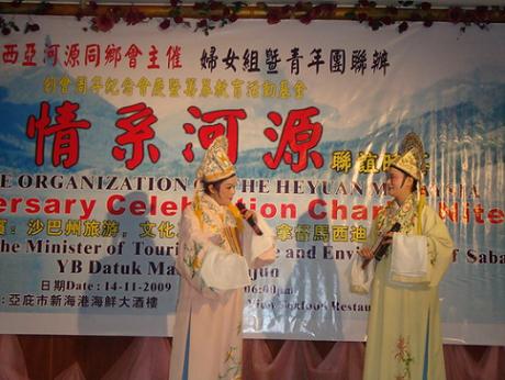 在進行鳴鑼開幕儀式、贈送紀念品儀式和一周年切蛋糕儀式后,一臺結(jié)合馬來西亞本地文化與河源客家文化的聯(lián)誼晚會精彩上演。作為中國首批國家級非物質(zhì)文化遺產(chǎn)的紫金花朝戲及被廣東省僑辦、省文化廳、省旅游局確定為廣東省首批中華文化傳承基地的花朝戲劇團,其所帶來的傳統(tǒng)花朝戲《賣雜貨》、《梁山伯與祝英臺》等節(jié)目被重點推出,演員們也不負眾望,精彩詼諧的表演讓全場嘉賓大飽眼福,獲得熱烈掌聲。