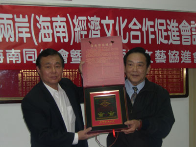 臺北市海南同鄉(xiāng)會理事長符子正親自會見并組織和主持了迎接訪問團(tuán)一行的座談會,賓主雙方互贈禮品。