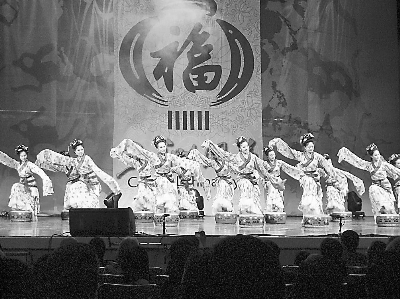 隨著《春節(jié)序曲》的播放,20個身穿紅色水褲的姑娘提著燈籠魚貫而入,載歌載舞。臨近結(jié)束,身著節(jié)日服裝,手拿鞭炮、雙魚的本地兒童擁上舞臺,又蹦又跳,把中國人在傳統(tǒng)節(jié)日里熱鬧歡騰、喜氣洋洋的場面表現(xiàn)得淋漓盡致。