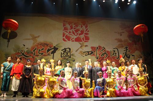 熱烈喜慶的《新春花鼓》拉開了 “文化中國·四海同春”歐洲巡演的序幕。美麗婀娜的維族舞蹈《頂碗舞》、熱情奔放的藏族舞蹈《快樂藏人》、氣勢雄渾的馬頭琴獨(dú)奏《萬馬奔騰》贏得陣陣掌聲;歌唱家呂薇的一曲充滿鄉(xiāng)音的《采茶舞曲》,讓浙江籍僑胞倍感親切;著名男高音歌唱家劉斌鏗鏘有力的《咱當(dāng)兵的人》,將整臺(tái)演出推向高潮;美輪美奐的舞蹈《千手觀音》落下了藝術(shù)團(tuán)在法演出的帷幕。持續(xù)近三個(gè)小時(shí)精彩絕倫的演出不時(shí)地博得了觀眾雷鳴般的掌聲。僑胞們在《難忘今宵》的音樂聲中久久佇立,不愿離去,贊嘆“這是一場內(nèi)容豐富、充滿激情、民族特色濃郁、藝術(shù)水準(zhǔn)高超的演出,令人難忘”。他們由衷地感謝國務(wù)院僑辦在新春之際為旅法僑胞帶來的文化盛宴。