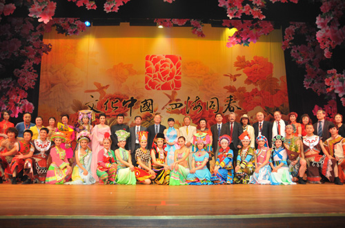 演出開始之前,在劇場(chǎng)外廳還展出了《中華民族全家!穲D片展,國(guó)僑辦副主任趙陽(yáng)和張利民大使為圖片展揭幕剪彩。參展的百余幅照片制作精良、集中展示了中國(guó)56個(gè)民族的生活習(xí)俗、服裝服飾、文化特點(diǎn)、周邊地貌等,吸引了眾多觀眾駐足觀看。