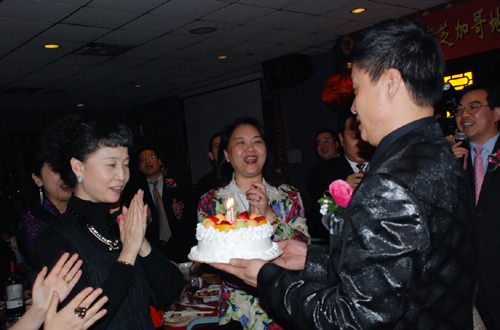 在歡迎宴會上,許又聲在總領事黃屏陪同下,向參加宴會的每一桌僑胞一一敬酒,向大家致以親切問候。來賓們和閻維文、夢鴿、陳軍、劉珂、雷佳、劉小娜等藝術家們爭相合影,歡聲笑語不斷。當天正值閻維文的夫人劉衛(wèi)星生日,大會特地準備了生日蛋糕,全場合唱“祝你生日快樂”。閻維文也清唱一首“在那遙遠的地方”來感謝大家,受到熱烈的歡迎。