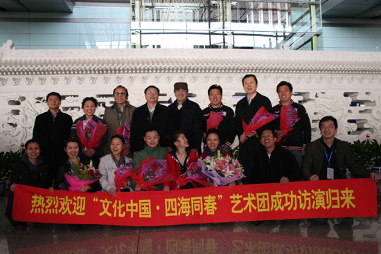中新社北京3月9日電 (南若然)結(jié)束在南美四國23天的慰僑巡演之后,9日下午,“文化中國·四海同春”赴南美洲藝術(shù)團載譽返回北京。該團團長、國務(wù)院僑辦副主任馬儒沛在首都機場接受中新社記者采訪時表示,赴南美巡演“鵬程數(shù)萬里,廣交四方友,笑迎八面風(fēng),演繹中華情”,并創(chuàng)造了四個之最。